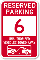Reserved Parking Sign: Reserved Parking 6, Unauthorized Vehicles Towed Away (with Graphic) Learn More...