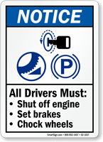 Truck Drivers Signs are perfect for any truck or truck stop area. Driver's Instruction Signs help direct drivers to designated areas and remind them to chock wheels or set brakes. Signs and Labels are an inexpensive and efficient way to help prevent accidents.